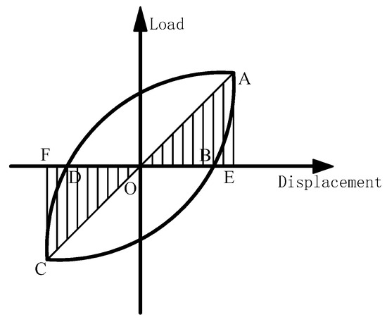 The energy dissipation capacity of the composite column specimens studied in this paper can be analyzed with reference to the wrapping area of the hysteretic curve. With reference to the building seismic test code [28], the energy dissipation coefficient E can be used to evaluate the energy dissipation capacity of the specimen. The calculation diagram is shown in Figure 16, and the calculation method is as follows: