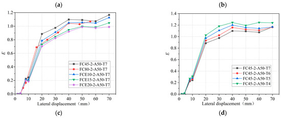 Figure 17 reveals several observations regarding the energy dissipation capacity of the specimen. Firstly, as the diameter-thickness ratio decreases, the energy dissipation capacity also decreases. Additionally, the energy dissipation capacity decreases with an increase in both the circumferential elastic modulus of the restrained tube and the tensile strength of the concrete. This phenomenon can be attributed to the increased constraint on the internal concrete when the thickness of the external GFRP tube and the circumferential elastic modulus of the restrained tube increase. Consequently, the damage to the concrete decreases proportionally. Similarly, when the tensile strength of the concrete increases, the extent of tensile damage to the internal concrete diminishes, leading to an increase in specimen strength and a decrease in energy dissipation capacity. Furthermore, the energy dissipation coefficient of the specimen increases with each loading cycle, indicating a gradual increase in energy dissipation capacity. However, as the loading displacement increases, the rate of increase in energy dissipation capacity initially decreases and then begins to rise again. During the initial stage of loading, the restraint effect of the GFRP tube on the micro-cracking and expansion of concrete gradually intensifies. As a result, the proportion of elastic deformation to total deformation increases, leading to a gradual decrease in the rate of increase in energy dissipation capacity. In the final loading stage, the external GFRP tube loses its restraint ability and undergoes destruction. This intensifies the damage to the core concrete, causing it to contribute the largest proportion to the total deformation and exhibit the least elastic deformation. Consequently, the increase in energy dissipation capacity becomes more significant during this stage.