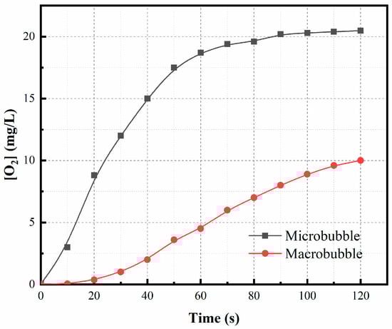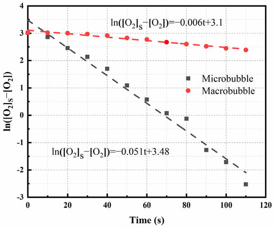 The model’s plot takes the form of a linear graph, with the slope representing the oxygen transfer coefficient. Figure 2 illustrates the relationship between ln([O2]s–[O2]) and time in both macrobubble and microbubble scenarios. Notably, the oxygen mass transfer coefficient for microbubbles (0.051 s−1) surpassed that of macrobubbles (0.006 s−1) by a factor of 8.5. This remarkable difference can be attributed to the negatively charged surface properties of microbubbles, which hinder their aggregation [32] and enable them to maintain a substantial specific surface area. According to the Yang–Laplace equation [23], the small diameter of microbubbles results in a significant internal pressure. All these factors collectively enhance the rate of mass transfer from the bubbles into the aqueous phase, leading to a higher concentration of dissolved gas in the aqueous phase. Consequently, a higher oxygen mass transfer rate significantly enhances the efficiency of Fe2+ oxidation.
