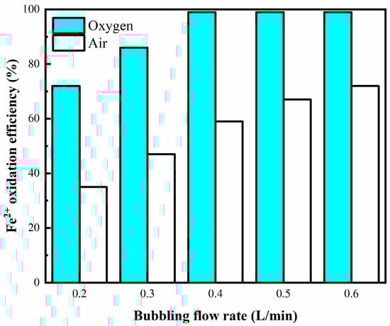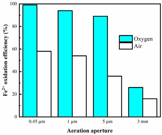 As shown in Figure 3, the efficiency of oxidation with pure oxygen and air was also compared. The oxygen concentration also affects the efficiency of oxidation of Fe2+; the higher the oxygen concentration, the faster the reaction rate. There are two possible reasons for this. On the one hand, the partial pressure of oxygen in the case of pure oxygen is greater than that in air, which enhances the mass transfer process. On the other hand, oxygen facilitates the formation of ·OH radicals, and consequently accelerates the oxidation process [25]. It has also been reported that reactive oxygen species, such as superoxide anion radicals, H2O2, and ·OH radicals, are generated during the reduction of molecular oxygen to water through the acceptance of four electrons [34].