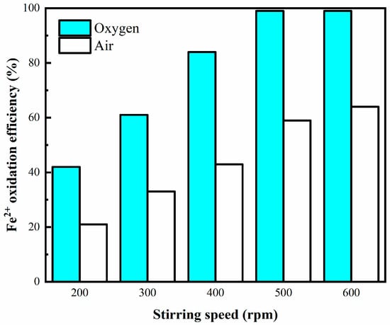 Oxidation efficiency of Fe2+ vs. stirring speed. Experimental conditions: oxidation time = 8 min, temperature = 75 °C, bubbling flow = 0.4 L/min, pH = 3.5, aeration aperture = 0.45 μm.