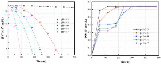 The effect of microbubble aeration as an enhanced method on the system is to disperse the gas, accelerate mass transfer, and promote the reaction; however, it also increases the activity of the reactants through the system’s violent collision, and reduces the threshold of reaction occurrence [14,41,42,43,44]. Because most conventional studies on Fe2+ oxidation have reported low reaction rates and used low Fe2+ concentrations, the DO concentrations can be considered approximately constant. However, the system is fully energized under the conditions of microbubble aeration, and its kinetics may be different from those of the conventional form.