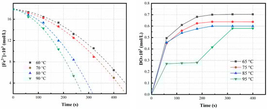 The impact of temperature on the rate of Fe2+ oxidation was also examined. As shown in Figure 7, in the temperature range of 65–95 °C, the oxidation ratio of Fe2+ increases with increasing temperature. The oxidation ratio of Fe2+ is primarily affected by the oxygen reaction activity, oxygen mass transfer coefficient, and DO concentration. According to the theory of kinetics, increasing the temperature can increase the percentage of activated molecules and the diffusion coefficient, and simultaneously decrease the oxygen solubility [6,39,40]. At low temperatures, the former dominates, promoting the generation of active oxygen species, increasing molecular collisions, and reducing activation energy. However, the decrease in the oxygen solubility becomes more pronounced at high temperatures, thereby inhibiting the formation of active oxygen. Conversely, the increase in the reactivity of the reactive species caused by the increase in the temperature is generally the main factor leading to a change in the oxidation rate of ferrous ions.