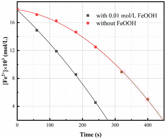 To investigate the impact of heterogeneous reactions, we conducted an oxidation experiment: a 0.01 mol/L FeCl2 solution was subjected to oxidation for one hour at a temperature of 75 °C, pH value of 3.5, and rotation speed of 500 rpm, followed by filtration. Subsequently, the filtered residue was introduced into a simulated lixivium and further oxidized under identical experimental conditions. As depicted in Figure 8, it is evident that the presence of precipitate significantly enhances the rate of oxidation compared to its absence.