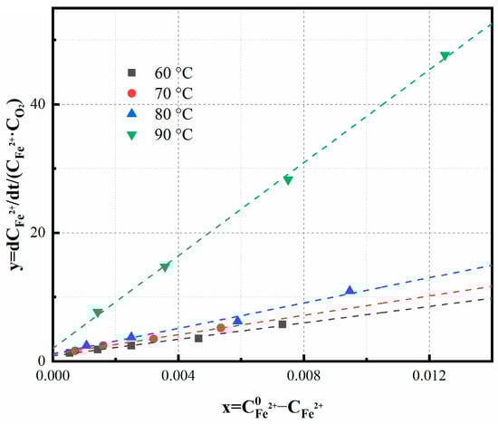 Using the experimental data for [Fe2+], [O2], and d[Fe2+]/dt, we plotted the left-hand side of Equation (9) against ([Fe2+]0−[Fe2+]) in Figure 9. The parameters ‘k’ and ‘k1’ were determined through linear regression analysis, with ‘k’ corresponding to the intercept, and ‘k1’ being derived from the slope of the linear regression.