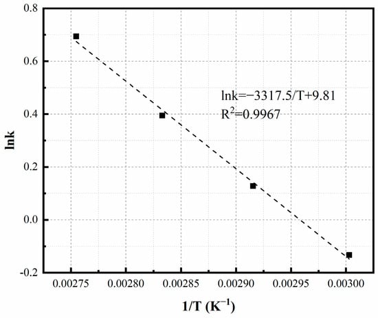 Temperature dependence of k. Experimental conditions: oxidation time = 8 min, bubbling flow = 0.4 L/min, pH = 3.5, stirring speed = 500 rpm, aeration aperture = 0.45 μm.