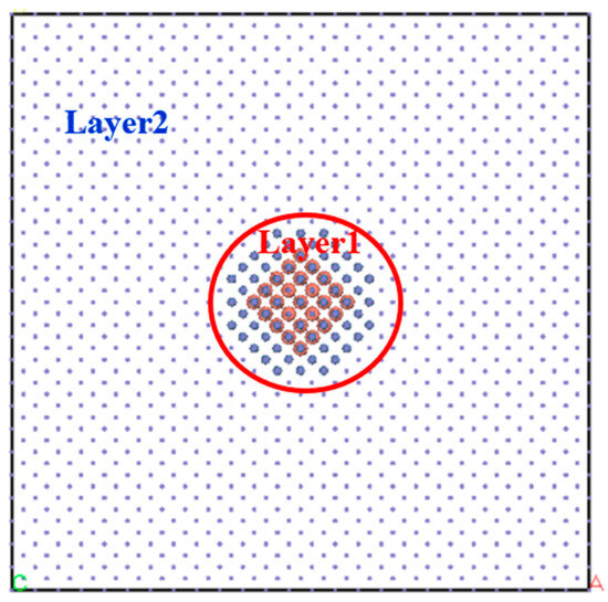 There is a Cu-Ni core–shell composite cluster with a diameter of about 2 nm in the center of the system, and the cluster is coherent with the matrix. In order to study the stable composition of clusters with different Cu and Ni ratios, the radial distribution of chemical composition of composite clusters in reference [10] was investigated. In the center of the simulation box, a sphere with a 2 nm diameter was selected, and all Fe atoms in the sphere were replaced by Ni atoms. In this way, the Ni cluster model was constructed with five layers of Ni atoms in the system. The four layers of atoms in the center of Ni cluster were replaced by Cu atoms, and the 1Ni cluster model was constructed. The three layers of atoms in the center of Ni cluster were replaced by Cu atoms, and the 2Ni cluster model was constructed. Rely on the same approach, the 3Ni cluster model and the 4Ni cluster model are constructed, respectively. The Cu cluster model is constructed by replacing all Ni atoms in the Ni cluster model. Therefore, all Cu clusters, 1Ni clusters with one layer of Ni shell covering the Cu core, 2Ni clusters with two layers of Ni shell covering the Cu core, 3Ni clusters with three layers of Ni shell covering the Cu core, 4Ni clusters with four layers of Ni shell covering the Cu core, and all Ni clusters are constructed. The cluster architecture is shown in Figure 1, and the number of atoms is shown in Table 1.