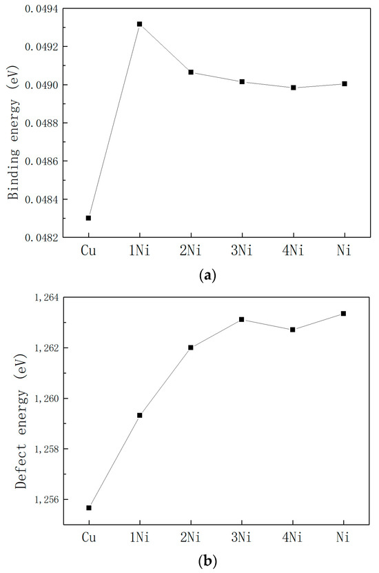 After the cluster models with different Cu-Ni ratios were constructed, the conjugate gradient method was used to optimize the geometric structure. The energy convergence criterion of the system was ≤10−4 kcal/mol, and the convergence criterion of the interaction force was ≤0.005 kcal/mol/A. Then, dynamic relaxation was performed at 300 K under the NPT ensemble with a time step of 1.0 fs. The system reached a relatively stable state after a cumulative time of 500 ps, and finally, the energy of the system was calculated. After dynamic relaxation, the binding energy, defect formation energy and interaction energy of the system are calculated by using the energy of the stable state, so as to find the component proportion of the cluster elements of the stable system model.