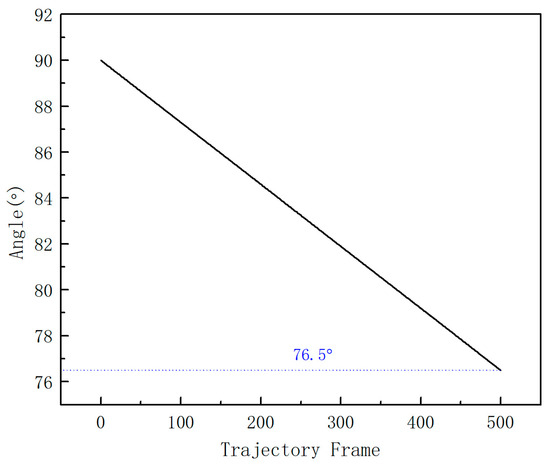 Curve of the γ Angle in the system as a function of trajectory frame, the dotted line indicates that the final γ Angle is 76.5°.