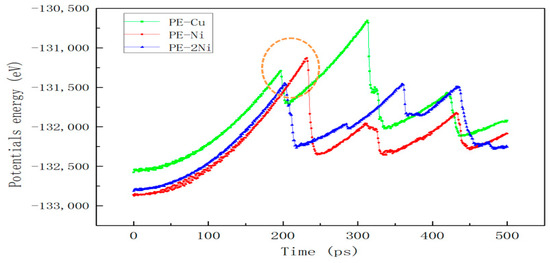In order to study the change process of Cu-Ni cluster defects under the shear strain, a pure Cu cluster system, a 2Ni composite cluster system, and a pure Ni cluster system were selected for the shear strain simulation, and the maximum change in strain γ Angle of the system after 500 ps was 13.5°. In Figure 4, the γ Angle changes from 90° to 76.5°, that is, a difference of 13.5°. Figure 5 shows the curve of the system potential energy as a function of time during the shear strain. With the increase in strain rate, the energy of the system gradually rises at the beginning, and then drops sharply after reaching the apex, and then the energy fluctuates like waves. By comparing the energy peak (EP) of the three systems, EP(Cu) > EP(Ni) > EP(2Ni), according to E = F × S, since the strain rate of the system is constant, the stress of the system is positively correlated with the potential energy at this time; that is, the pure Cu cluster has the largest strain resistance, the pure Ni cluster has the second largest, and the 2Ni composite cluster has the smallest. That is, the pure Cu cluster produces the largest resistance to the shear strain, and the 2Ni composite cluster has the smallest stress to the strain. The magnitude of shear stress is positively correlated with cluster hardness [23].