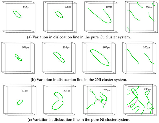 When the shear strain passes the critical stress point, the main structure of the cluster system still maintains the bcc lattice structure, and no new phase is generated. Figure 7 shows the changes in dislocation lines in the three systems of pure Cu cluster, 2Ni composite cluster, and pure Ni cluster at the critical stress point (corresponding time points are 197 ps, 202 ps, and 233 ps, respectively) and the next three frames. When the energy of the system reaches the critical stress point, with the increase in the stress variable, the dislocation ring in the Cu cluster system and Ni cluster system diffuses outward around the cluster, and the size becomes larger until it breaks and generates multiple dislocation lines in the system, and the cluster becomes the source of dislocation proliferation in the system. The number of dislocation lines increases the number of slip systems and makes the stress level of the system decrease rapidly. With the annihilation of the dislocation lines at the grain boundaries and the lack of new slip systems in the system, the stress level will gradually increase until a new dislocation line appears, at which point the stress level reaches the next peak. This happens repeatedly, causing the stress level to fluctuate.