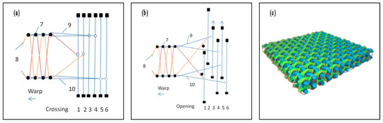 Schematic diagram of the interweaving of longitudinal warp and weft of 3D spacer Jacquard fabric: (a) shed closing; (b) shed opening; and (c) fabric structure diagram. 1,2—Jacquard healdwine; 3,4—heald frames; 5,6—heald frames; 7—weft yarns; 8—longitudinal warp yarns; 9—upper ground warp yarns; 10—lower ground warp yarns.