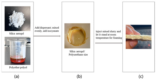 Diagram of preparation of silica aerogel/polyurethane foam composite 3D spacer Jacquard fabric: (a) Silica aerogel powder was added into the weighed polyether polyol; (b) Mixed size prepared by adding isocyanate; (c) Filling aerogel mixed slurry into the prepared 3D spacer Jacquard fabric with syringe.