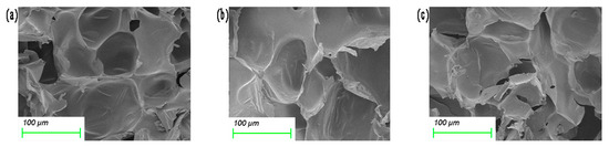 The SEM image of the sample is demonstrated in Figure 6. Figure 6i is a cross-sectional view of the polyurethane foam. It can be seen that the pore size of foam is evenly distributed, with a diameter of about 200 μm. From the electron microscope image of the composite spacer fabric, it can be seen that the pore size of the core layer of the spacer fabric is different, with pore diameters ranging from 30 to 100 μm. Figure 6j is an electron microscopic view of the 3D spacer Jacquard fabric. It can be seen that there is a large gap between the yarns. Figure 6a displays a polyurethane foam composite spacer Jacquard fabric without the silica aerogel, with a relatively uniform pore diameter of 80 μm and a foam hole wall completion. The pore diameter of foam decreases with the increase in aerogel dioxide content, mainly due to the fact that the increase in aerogel content leads to the increase in system viscosity, which makes the pore diameter of foam smaller. Moreover, the agglomeration will occur with the increase in aerogel content, and an uneven dispersion in the slurry will affect the nucleation of foam, as shown in Figure 6h. When the content of aerogel is 13.3%, the foam in the core layer is severely broken, which means fewer complete foam pore walls.
