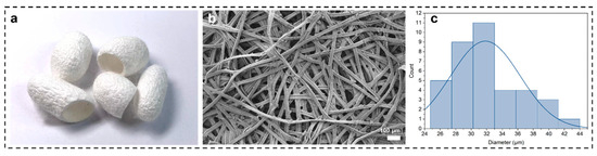 Figure 1 shows the morphology of the original silk. The digital image of the cocoons, shown in Figure 1a, are spindle shaped, with a bright white surface accompanied by irregular wrinkles and a tough, lustrous texture, made of layers of silk attached to the cocoons. SEM characterization was performed as in Figure 1b, which shows that a bundle of silk fibrils is composed of two piles of SF wrapped by sericin, and we counted the diameters of the silk protofibrils as in Figure 1c, which ranged from 20 to 40 μm in diameter and the mean diameter of the fibers is 31.83 μm.