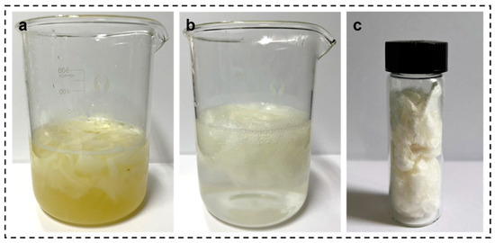 (a) Digital image of the first degumming system, (b) digital image of the third degumming system, (c) digital image of the degummed SF.