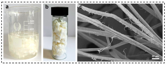 (a) Digital image of SF pretreated with mixed solution, (b) SF pretreated with mixed solution, (c) SEM image of pretreated SF with mixed solution.