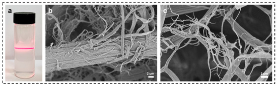 Dry the SF after the above swelling treatment, put it in the high-speed shear, add an appropriate amount of deionized water for mechanical stripping, and strip it for 15 min to obtain the SNF solution. As shown in Figure 5a when laser light was transmitted through the SNF solution, the Tyndall effect was clearly observed, which proved that the fibrils in the solution were dispersed to the nanoscale. Meanwhile, the SF taken from mechanical shearing for 1 min and mechanical shearing for 15 min were subjected to SEM characterization as shown in Figure 5b,c, which shows that the silk protofibrils in mechanical shearing for 1 min have shown the exfoliation of micrometer-sized filaments. In contrast, the filaments in shearing for 15 min can be observed to have obtained a certain number of nano-scaled fibrils.
