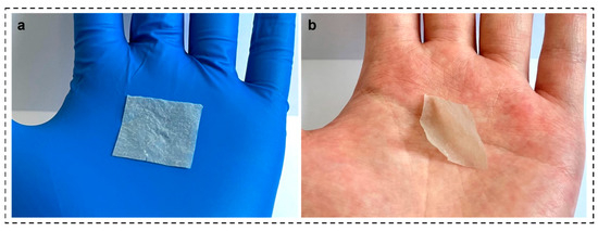 The SNF solution was vacuum-evacuated through a mixed cellulose filter membrane with a diameter of 50 mm and a pore size of 0.2 μm, and the SNF membrane was obtained after drying at room temperature. As shown in Figure 6a,b, the SNF membrane was observed to have excellent moisture-sensitive response properties when the SNF membrane was placed in wet hands and the membrane rapidly curled inwards within a second, while in dry rubber gloves, the membrane adhered to the surface of the gloves. Upon placing the membrane in a wet and dry environment, it spontaneously returns to its original flat state. Since SF are composed of different hydrophilic and hydrophobic amino acids, it is speculated that this bending response is due to the water molecules in the humid environment forming new hydrogen-bonding interactions with polar groups (-NH, -OH, C=O) in certain amino acids, leading to this rapid moisture-sensitive response. In summary, it can be concluded that SNF membranes can be used as a more stable moisture-sensitive response material. To further observe the surface morphology of the SNF membrane, the membrane was characterized by SEM, as shown in Figure 6c, the membrane was made of a large number of fine nano-scaled fibrils interwoven and stacked. Meanwhile, the diameter distribution of the fibrils was counted as in Figure 6d; the diameter was mainly concentrated around 120 nm, and the distribution range was within 35–250 nm, with an average diameter of 111.02 nm.