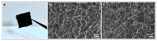 SNF/MXene was prepared by the drop-coating method, as shown in Figure 7a, the surface of the composite membrane was black with a certain flexibility, in order to further observe its surface structure, SEM characterization was carried out for the composite membranes with different concentrations respectively. Figure 7b,c are the SEM images of the composite membranes with MXene content of 60% and 80%, respectively, and obvious MXene composite membrane crumpled characteristics can be observed. The obvious crumpled characteristics of MXene composite membranes were observed, and the difference between the two was that the crumpled density was different, and the crumpled density of the composite membrane with 60% MXene content was obviously lower than that of the composite membrane with 80% MXene content, and the thickness of the membranes was around 10 μm by SEM characterization.
