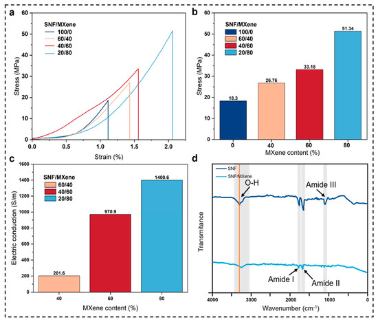 (a)Tensile stress-strain curves of composite films with different SNF and MXene weight ratios, (b) maximum stress diagram of composite films with different SNF and MXene weight ratios, (c) conductivity of SNF/MXene films with different MXene content, (d) FTIR spectra of pure SNF film and SNF/MXene composite film.
