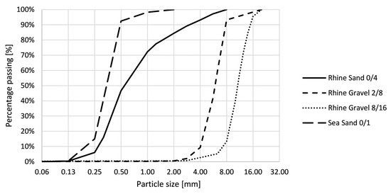 The self-compacting concrete (SCC), which will be cast into the printed formwork, is designed by Desnerck et al. [34] and meets the requirements of concrete used in a sea environment exposed to rain and frost (EE2). The mixture consists out of Portland cement CEM I 52.5 N and limestone filler. Sand 0/4 and two types of gravel (2/8 and 8/16) are used as aggregates. To improve the flowability, a superplasticizer (MasterGlenium® 51 con 35%, Master builders Solutions Belgium nv, Ham, Belgium) is implemented. The mix composition is given in Table 2.