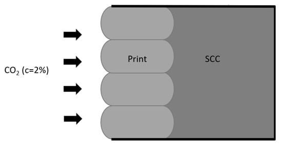 After 28 days of curing of the printed concrete (RH = 60 ± 5%; T: 20 ± 2 °C), the printed wall elements (400 mm × 100 mm × layer width) were placed in steel molds and SCC was cast next to the formwork. The new combined specimens are demolded the day after and are wrapped in aluminum foil to only expose the printed side to the air of the climatized room (RH = 60 ± 5%; T: 20 ± 2 °C). In this way, the cast concrete is not in contact with the open air. The specimens were then cured for another 35 days in the climatized room (RH = 60 ± 5%; T: 20 ± 2 °C).