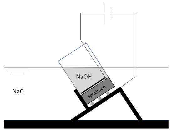 The test was performed according to NT Build 492 [36]. Specimens are exposed to a vacuum for 4 h. One hour before ending the vacuum, a saturated Ca(OH)2 solution is added to submerge the specimens. Twenty-four hours after the vacuum exposure started, the specimens are placed in the setup to test the chloride ingress, as shown in Figure 7. The water level of the NaOH (0.3 M) and the NaCl-solution (10%) is equal, so no additional liquid pressure is present during testing. A voltage is applied over the specimens based on the initial current in the system. After 24 h, the specimens are taken out of the setup and split. By spraying silver nitrate (0.1 M) on the surface, the ingress of chlorides can be measured in 7 different places on each side. Based on equation 5 of NT Build 492 [36], the chloride migration coefficient is determined.