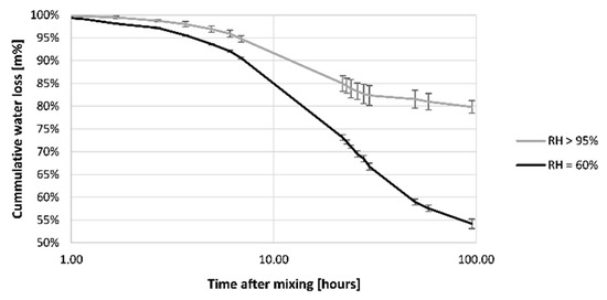 where is the cumulative water loss [%], is the cumulative water loss at measurement [g], and is the theoretical quantity of water immediately after mixing [g].