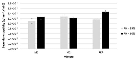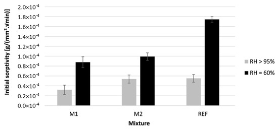 The samples were coated after drying with one layer of epoxy at the top and the bottom side. The nominal dimensions of the exposed surface were measured before testing. Additionally, the mass of the coating and the dry sample was determined by measuring the specimen before and after coating in dry condition. Before testing, the specimens were assumed to be dry as no mass loss was measured after 24 h of drying in an oven at a temperature of 40 °C. The test was performed by placing the specimens in a box on line supports, exposing the side to the water. Water (20 °C) was added until the water level was 5 ± 2 mm above the top of the line supports. On top of the container, a lid was placed to prevent evaporation. The mass of the samples was measured after excess water was removed from the exposed surface by a wet cloth. The mass was obtained at 1, 3, 7, 15, 30, and 60 min and every hour up to 6 h, 24 h, and 144 h after water contact. The results of the test are calculated based on Equation (4).