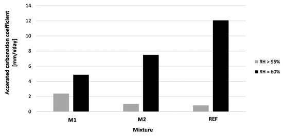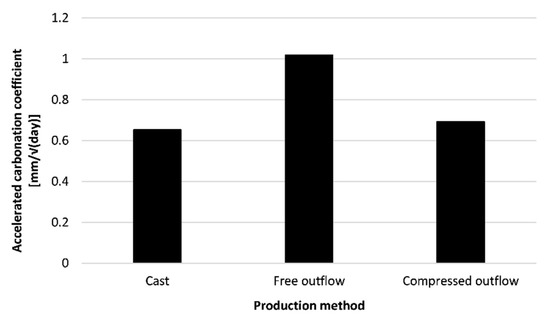 - The ingress of the carbonation front after 28 days () was calculated based on the obtained carbonation rate after regression instead of the data obtained after 28 days of exposure. It is believed that this would reduce the measurement error. The regression equation was of the form:where t is the exposure time [days], is the carbonation rate, and x is the carbonation ingress.