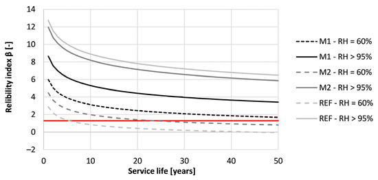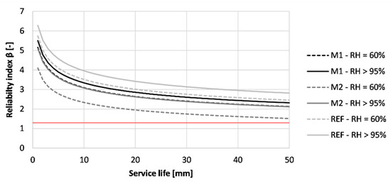 Figure 22 shows the reliability index for the first 50 years of the tested printed concrete exposed to chlorides. All tested concrete specimens obtained a reliability index that is larger than 1.3 after a service life of 50 years. This means that none of the tested concrete is expected to reach depassivation within the desired life span of the structure. The concrete cured at RH > 95% obtained higher β-values after 50 years (M1: 2.32; M2: 2.12 and REF: 2.82) than concrete cured under RH = 60% (M1: 2.13; M2: 1.52 and REF: 2.46).