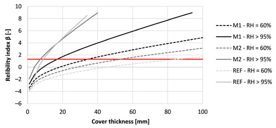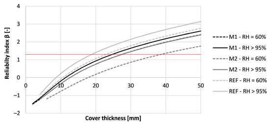Nevertheless, the increase in reliability index by curing the concrete properly is lower for chloride-induced corrosion than for carbonation-induced corrosion. This can be seen in Figure 23. While for carbonation-induced corrosion calculations, the improvement of the curing could lead to a decrease in cover thickness up to 80 mmis is this for chloride-induced corrosion only 11 mm. This indicates a lower effect of the curing on the chloride resistance of the printed concrete. For concrete cured under RH = 60%, the required concrete cover for M1, M2, and REF are respectively 28 mm, 39 mm, and 23 mm. By improving the curing condition to RH > 95% for 28 days, the required concrete cover becomes 25 mm, 28 mm, and 19 mm of these same mixtures. All of the obtained values are lower than the Eurocode 2 prescribed value of 45 mm. Therefore, a proper resistance against chloride-induced corrosion could be expected for these mixtures.