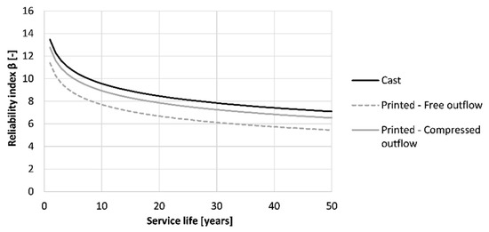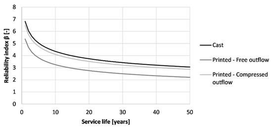 Similar to the carbonation resistance, casting can be seen as the best production method for the formwork (β50 years = 3.06), as shown in Figure 24. When printing and properly curing the formwork, the reliability index drops to a value of 2.21. Adding side trowels to the nozzle improves the chloride resistance and increases the reliability index to a value that is nearly similar to the one of the casting procedure (β50 years = 2.87). Nevertheless, taking the thickness of the printed layer equal to the concrete cover described in Eurocode 2, a service life of 50 years could be obtained for the structure regardless of the fabrication method.