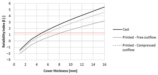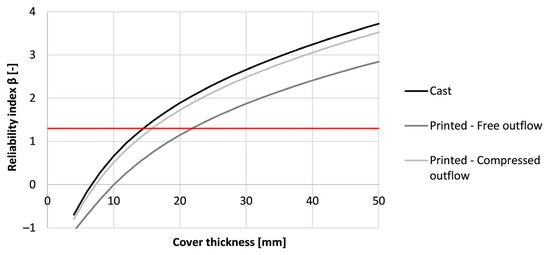 As the resulting reliability index values are high, a reduction of the formwork thickness can be made (see Figure 21). In the case of casting, the required cover thickness is at least 5 mm while for printing with a free outflow this is 9 mm. By adding side trowels to the nozzle, the required thickness is reduced by 3 mm. Despite the improved carbonation resistance by modifying the nozzle with side trowels, the gain in cover thickness is limited. Therefore, the benefits reflected within a real-life application will be low as long as the curing has been performed adequately. At that point, the application of side trowels at the nozzle becomes an aesthetic choice rather than an economical choice.
