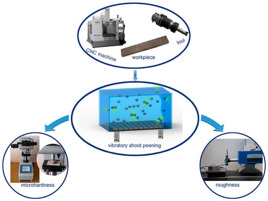 A general diagram of the experiment is presented in Figure 1. The research focused on analyzing the impact of variable vibration peening conditions on surface roughness, as well as selected parameters of the surface layer hardening after the process.