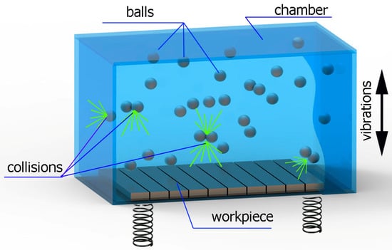 The tested samples were mounted in the working chamber in such a way as to enable shot peening of the previously milled surfaces. The bearing steel balls with a hardness of 60 HRC and a diameter of 9 mm were used as the machining medium. The vibration frequency was constant during the experiment and was set at 7Hz. The variable parameters were the vibration amplitude and the shot-peening time (Table 2). The vibratory shot peening was carried out without additional machining fluids. The samples were mounted using two pressure strips located at opposite ends of the samples.