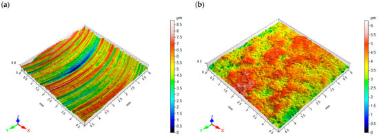 Figure 7a,b shows the surface topography after milling and vibratory shot peening, respectively. The distribution of micro-irregularities on the milled surface results from the geometry of the blade and its diameter, as well as the machining kinematics and, in particular, the feed per tooth. The average value of roughness parameters after milling was Sa = 0.95 µm and Sz = 8.9 µm.
