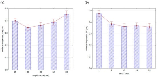 Surface roughness (Sa parameter) after vibratory shot peening: (a) variable amplitude (constant t = 13 min), (b) variable time (constant A = 42 mm).