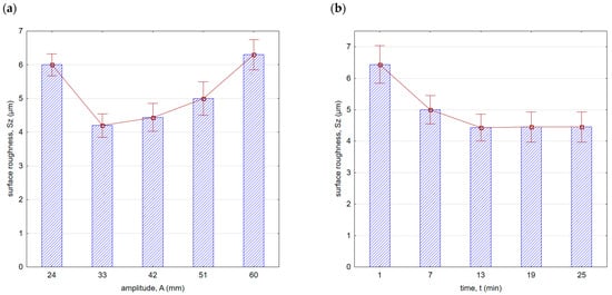 Surface roughness (Sz parameter) after vibratory shot peening: (a) variable amplitude (constant t = 13 min), (b) variable time (constant A = 42 mm).