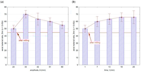 Areal material ratio after vibratory shot peening: (a) variable amplitude (constant t = 13 min), (b) variable time (constant A = 42 mm).