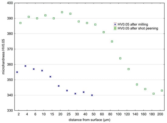 After milling, a characteristic increase in microhardness of the surface layer just below the surface (at a depth of 20–30 μm) was observed. The mechanical impact of the cutting blades on the workpiece material contributes to the plastic deformation of material and increases temperature in the area of contact between the tool and the workpiece, which always affects surface layer properties. In turn, due to the specific nature of the vibratory shot-peening process, the impact of the striking balls on microhardness and the depth of the hardened layer is significantly greater compared with milling.