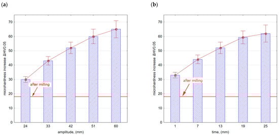 Figure 13 shows the microhardness increase after vibratory shot peening. The speed of the balls moving in the chamber increases with an increase in amplitude (Figure 13a). This results in an increase in the kinetic energy of the peening elements that hit the sample surfaces. The precise determination of energy is difficult due to the process randomness. The freely moving balls lose energy by colliding with each other or with the walls of the chamber, thus changing the direction of their movement and speed. In turn, as the vibratory shot-peening time increases (Figure 13b), the number of impacts per sample surface increases too, i.e., the degree of ball impact coverage on the surface also contributes to the hardening of the surface layer. In both cases (influence of amplitude Figure 13a,b), the microhardness significantly exceeds the values obtained after the milling process.