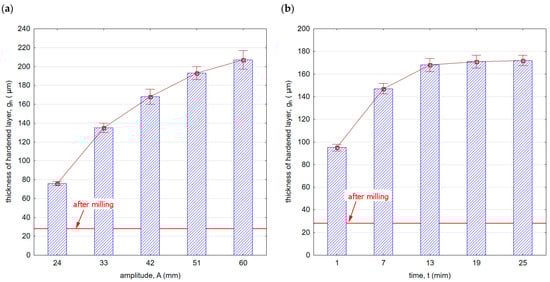The influence of shot-peening time on the thickness of the hardened layer is also visible (Figure 14b). The largest increase is observed up to the 13th minute of the process, and a further increase in time does not significantly affect the increase in the hardened layer thickness. Amplitude has a greater impact on the increase in hardened layer thickness compared with shot-peening time.