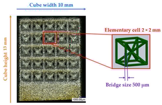 The geometric characterisation of the samples was used to assess the quality of the SLM process. Figure 1 defines the target dimensions for the SLM process. After fabrication and cleaning of the structures, these dimensions must be checked to document geometric deviations such as warpage or process-related satellite adhesion. Table 4 below shows the mean values and deviations for the relevant structural parameters. The measured values for bridge size and elementary cell width were above the specified target values. This may have been caused by adhering powder that had not been removed. The height and width of the cube, on the other hand, indicated shrinkage of the sample.
