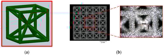 (a) Model used for the fabrication of the cubic space-centred unit cell; (b) top surface of a BCC matrix fabricated by SLM.