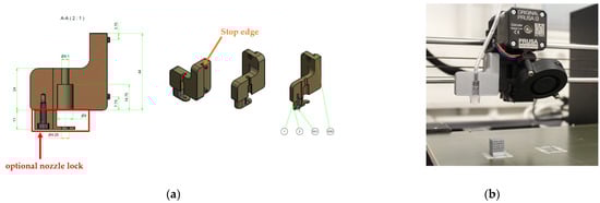 The second step in the modification of the printer was the development of a holder for the functionalisation nozzle. A section of the parts drawing for the holder is shown in Figure 3a on the left. The bracket could be easily attached to the fan of the extruder unit using two M3 × 12 screws. In addition to the fixing to the fan housing, a stop edge (orange arrow) was included in the design to ensure that it was flush with the fan housing when correctly fitted. If the functionalisation nozzle, which was designed as a Luer lock connection, was not fully seated in the holder, it could be additionally secured using a clamping bracket and an M3 × 8 screw (red frame). The Luer lock holder mounted on the printer is shown on the right in Figure 3b.