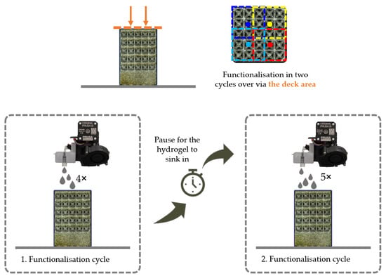 The matrix structure was filled exclusively from the surface of the manufactured component. This was done in two cycles with a pause between the first and second cycle to allow the alginate solution to penetrate the structure by gravity. The process flow for this variant is shown in Figure 4 and described below.