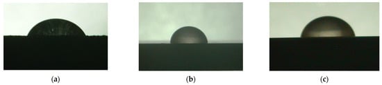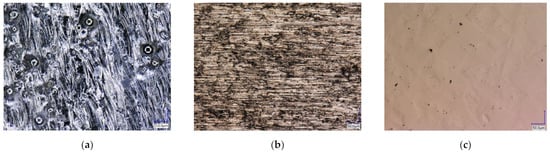 The light microscope images of the three surface conditions are shown in Figure 5. The surface quality was used to classify the results of the contact angle measurements. The behaviour of the biopolymer and crosslinker was not only related to the surface roughness that could be measured, but also to the characteristics of the topography. The as-delivered sample (Figure 5a), which was not treated after the SLM process, had spherical silver shiny inclusions of different sizes on the surface. These inclusions were located in process-induced crater-like depressions on the surface. The surface was also silver lustrous and had an irregular surface topography. The ground surface showed a uniform, periodic pattern on the surface, mainly characterised by grooves of different sizes resulting from the grinding process (see Figure 5b). The polished sample was characterised by small dark pores on the surface and faintly visible smaller areas arranged in a square (see Figure 5c).