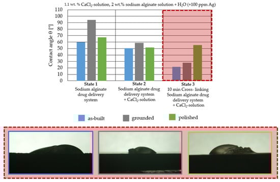 Both the as-built surface and the polished surface had a larger wetting area than the drop on the ground surface. Figure 7 shows the measured contact angles for both the state just considered and the other two states as a function of the three surfaces. The smaller contact area on the ground surface resulted in a contact angle of 94°. The alginate solution showed contact angles of 60° and 67° on the unpolished and polished surfaces. In condition 2, after the addition of the calcium chloride solution, a decrease in the wetting angles could be observed for all three surfaces. These were now 50.5° on the as-built sample, 58.5° on the ground sample, and 51.5° on the polished sample. As in condition 1, the ground surface showed the largest contact angles. The alginate-containing solution showed a 1° larger contact angle on the polished surface than on the as-built sample. Due to the strong cross-linking by the CaCl2 solution, a solid mass was formed in the third state, which could no longer be considered as a liquid. In this case, contact angle analysis could only be used for the first two states. For completeness, all states are shown in Figure 7.